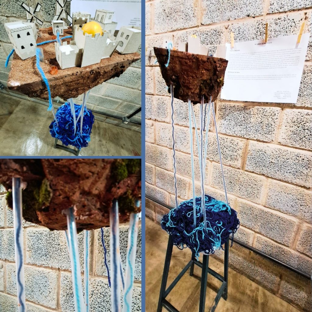 “Com inspiração em cidades árabes, a nossa obra faz uma releitura da cidade de Isaura, descrita no conto de Ítalo Calvino. Sob um imenso lago em tons de azul, canos se erguem e sustentam a cidade que cresce e se desenvolve em uma base rochosa. Os moinhos de vento são responsáveis por extraírem a água, mecanismo que garante a sobrevivência e vitalidade da cidade.” (Ana Vitória, Luiz Augusto, Renan Horsay e Thalles Forseca).