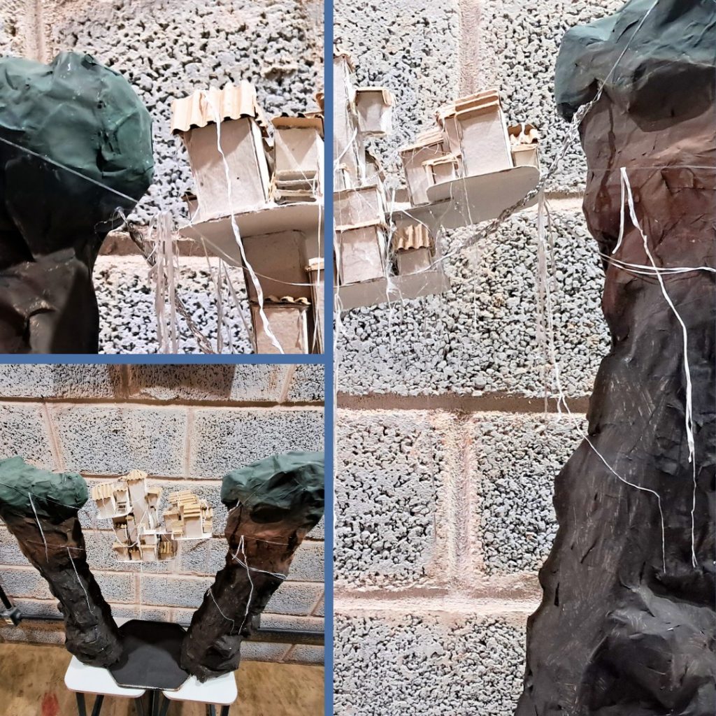 “A proposta da escultura inspirada na cidade de Otávia, descrita por Ítalo Calvino em As Cidades Invisíveis, busca representar a fragilidade e interdependência da vida urbana. Otávia é uma cidade suspensa sobre um abismo, conectada por fios e passarelas, onde cada elemento depende do outro para sua existência. a escultura utiliza telas de aranha como metáfora para a sustentabilidade suspensa e vulneráveis. A cidade e seus habitantes estão conectados entre si, e a escolha de posicionar a cidade entre duas montanhas, sobre um precipício, reforça a ideia de estabilidade ilusória e que a queda é uma possibilidade constante.” (Cecília Barbosa, Emily